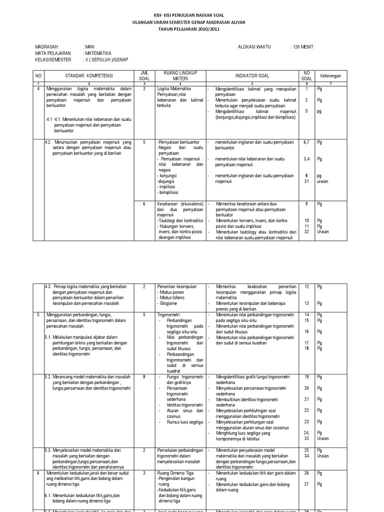 Perangkat ini salah satu hal wajib yang harus dibuat oleh guru namun jarang yang membuatnya. Demikianlah kisi kisi soal uas pas matematika wajib kelas x 10 jenjang sma ma semester 1 kurikulum 2013 tahun pelajaran 2019 2020 yang dapat saya bagikan semoga bermanfaat. Kisi-kisi ulangan umum semester gasal matematika wajib kelas x mipa by jurotunguru KISI-KISI SOAL ULANGAN UMUM SEMESTER GASAL TAHUN PELAJARAN 20162017 Mata Pelajaran.
