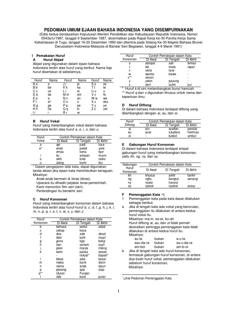 Karena penuntutan itu perlu dilengkapi Panitia Pengembangan Bahasa Indonesia Departemen Pendidikan dan Kebudayaan yang dibentuk oleh Menteri Pendidikan dan Kebudayaan dengan surat keputusannya tanggal 12 Oktober 1972 No. Dengan menggunakan huruf kata dan tanda baca sebagai sarananya. Ejaan yang disempurnakan memuat kaidah-kaidah bahasa Indonesia seperti penulisan huruf penulisan kata penulisan tanda baca dan penulisan unsur serapan.