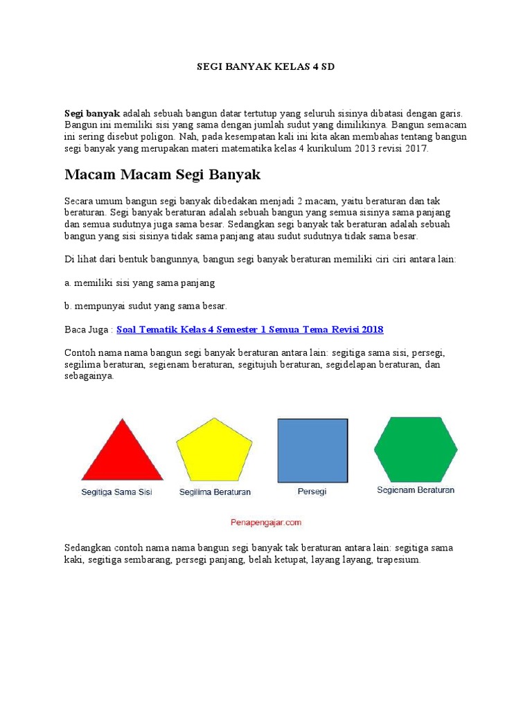 Soal Ulangan Segi Banyak Kelas 4 SD Kunci Jawaban. Pada postingan ini juga terdapat bukan contoh segi banyak. Blog yang berisi soal-soal jenjang SD yang bisa Anda unduh dengan gratis.