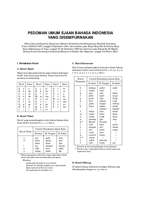 Ekawarna ekstrakurikuler elektroteknik infrastruktur inkonvensional introspeksi kolonialisme kosponsor mahasiswa mancanegara multilateral. Pengertian Ejaan yang Disempurnakan Ejaan adalah keseluruhan peraturan tentang pelambangan bunyi ujaran dan hubungan antara lambang-lambang itu. EYD 1 PEDOMAN UMUM EJAAN BAHASA INDONESIA YANG DISEMPURNAKAN Edisi kedua berdasarkan Keputusan Menteri Pendidikan dan Kebudayaan Republik Indonesia Nomor 0543aU1987 tanggal 9 September 1987 dicermatkan pada Rapat Kerja Ke-30 Panitia Kerja Sama Kebahasaan di Tugu tanggal 1620 Desember 1990 dan diterima pada Sidang Ke-30 Majelis Bahasa Brunei Darussalam-Indonesia-Malaysia di Bandar Seri Begawan tanggal 46 Maret 1991 I.
