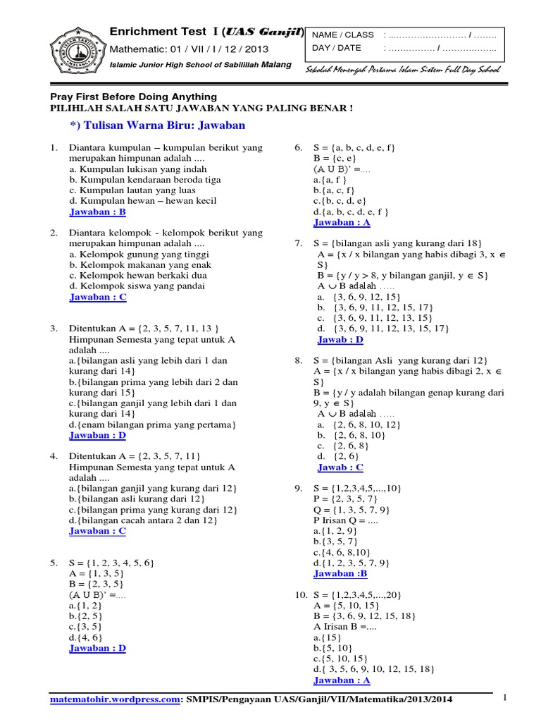 Soal Matematika Kelas 7 Semester 1 2 Dan Kunci Jawaban Kurikulum 2013 Tahun 2018 Info Pendidikan Terbaru
