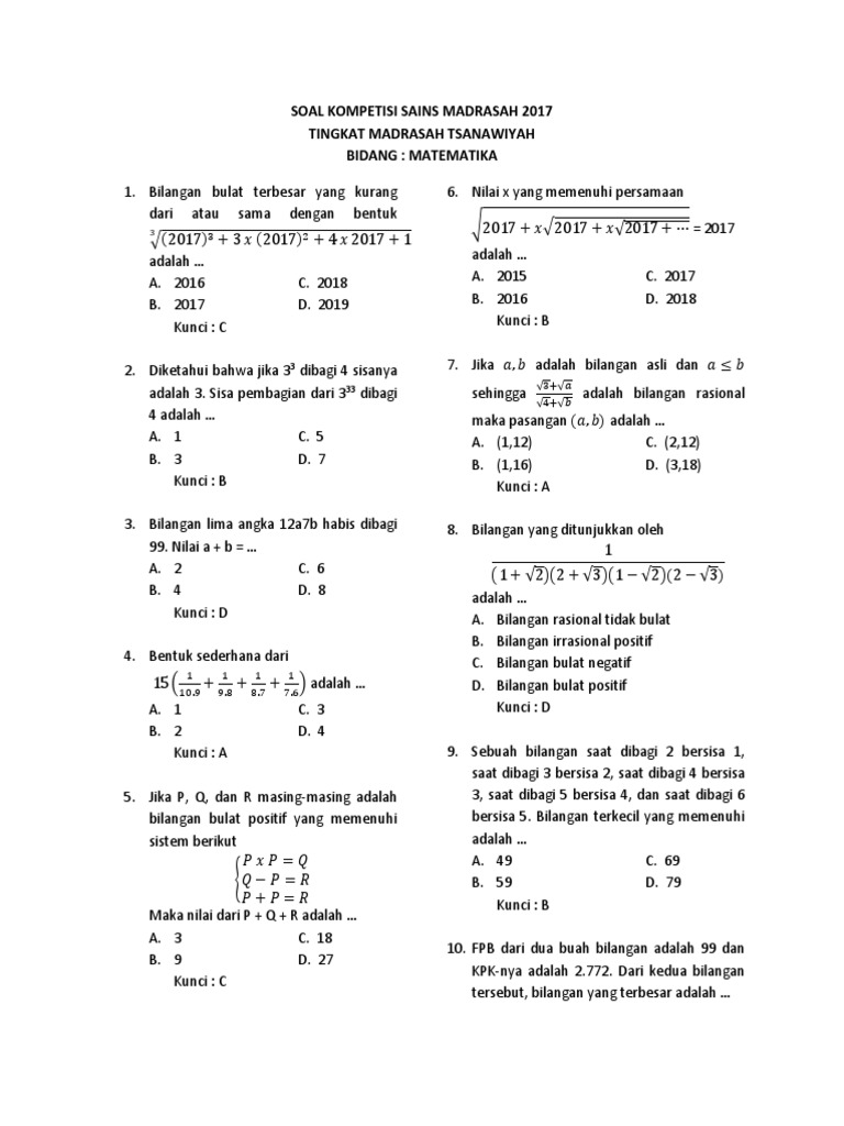 Download Soal Ksm Mi Matematika 2019 Dan Kunci Jawaban Guru Ilmu Sosial. Masing-masing soal bernilai 1 jika dijawab dengan benar dan. Kumpulan Soal dan Jawaban OSK 2017 Semua Bidang jenjang SMA.